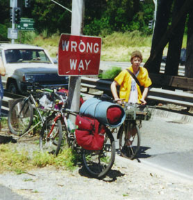 Once me and Robert were invited to go camping up in Cache Creek, which is kind of near Sacramento. Our hosts asked us if we wanted a ride but we decided that since we were both veteran bike messengers and that we already had a couple of 80-mile rides under our belts, we would just ride up. The car caravan left on Friday evening for the weekend trip, but we decided to leave at six on Saturday morning so we could have time to <prepare>. Never mind on how we decided to prepare; all I can really say is by the time we had to go, we were pretty fuckin loopy. Remember how I said we were going to leave at six in the morning? At that rate, if you keep up a good clip, you should be rolling into Cache Creek by sundown, about 5 or 6:30 dst. Well, fourteen hours, two packs of smokes, an ill-advised trek across a bridge only meant for cars and about three or four 40's later we find ourselves in the middle of fucking nowhere. Of course the sun was already down, of course there was no highway lighting, and, I must remind you, of course we're looped. Bike lights? Nah! Followed the light from Robert's burning cigarette. We pulled up around midnight, to laughter and applause. At least our hosts were nice enough to drive us back. I have a lot more stories like this. I just have to wade through the not-so embarrassing ones.